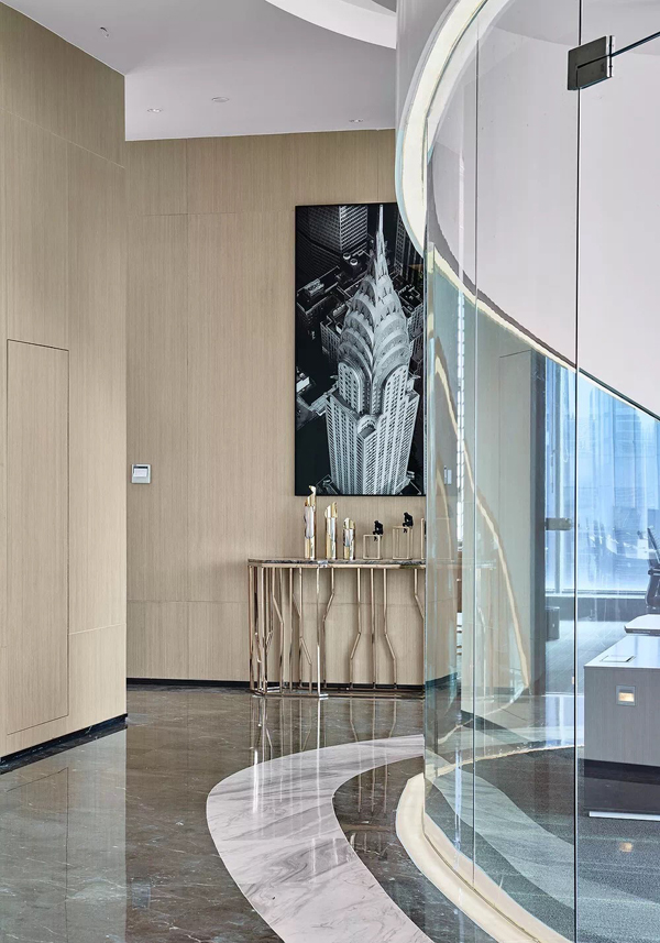 不同的颜色会给人不同的感觉,办公室走廊是人从社会集体空间走向个人空间的通道,走廊可以采取浓厚色彩向轻盈色彩渐变。引导人的心情从沉重压抑向轻松愉快转变。